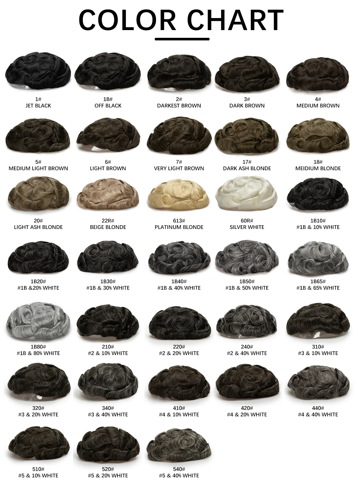 | Toupee Color | 60R, 2, 1B80, 1B65, 1B40, 1B50, 1B30, 1, 22R, 1B20, 20, 1B, 18, 1B10, 613, 17, 7, 5, 6, 4, 3 |